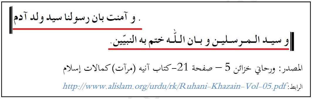 يقول "وبأن الله ختم به النبيين"،هذا كلام واضح في اعتراف متنبي القاديانية أن الله تعالى ختم النبوة بمحمد صلى الله عليه وسلم.