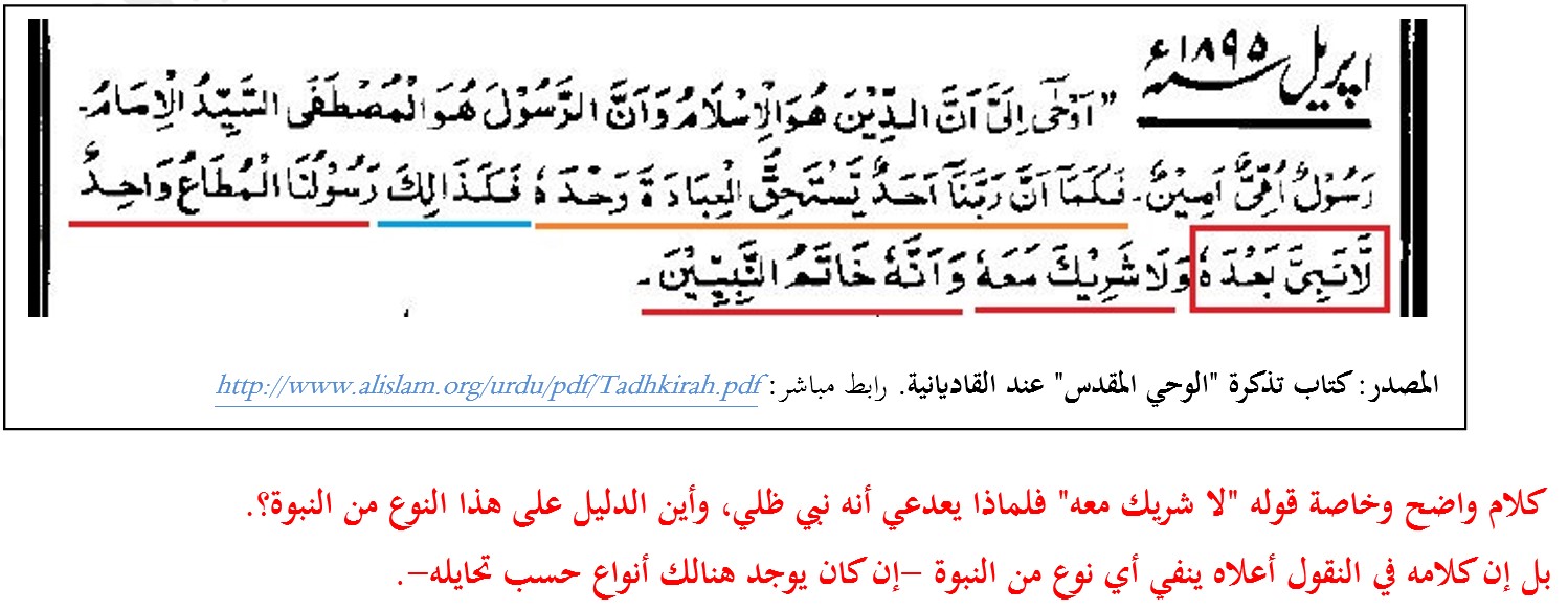 هنا يفسر متنبي القاديانية كلمة "خاتم النبيين" بما فسره رسولنا محمد صلى الله عليه وسلم يقوله "لا نبي بعدي". وقد أوضحت في البحث السابق أن ذلك يشمل لجميع أنواع النبوات، لأنه نفي عام للنبوة بعده بغض النظر عن نوعها.