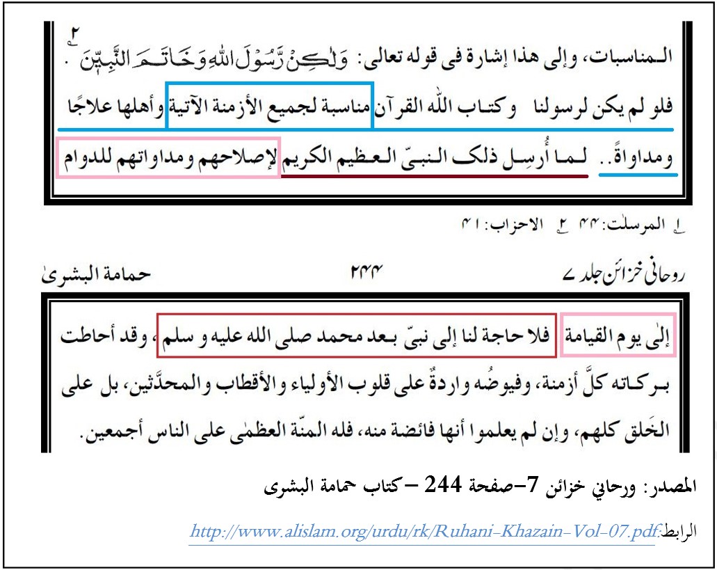 إذا كان الرسول صلى الله عليه وسلم وكتاب الله القرآن مناسِبَين لجميع الأزمنة الآتية وأهلها لإصلاحهم ومداواتهم للدوام إلى يوم القيامة، فما حاجتنا لرسول جديد؟ وهذا ما أكده غلام أحمد القادياني بقوله " فلا حاجة لنا إلى نبي بعد محمد صلى الله عليه وسلم".