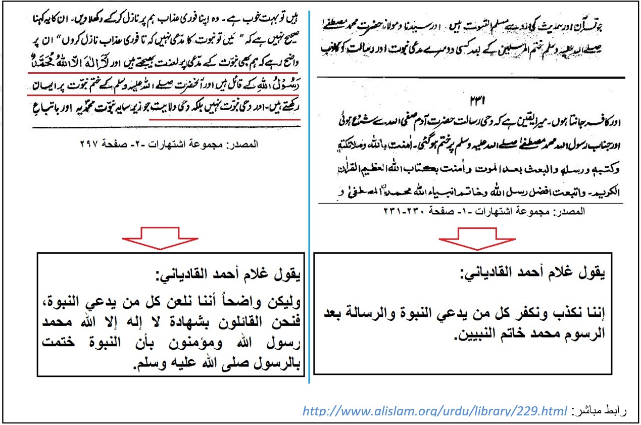 فها هو يقول أن دين محمد صلى الله عليه وسلم إلى يوم القيامة، ومحمد آخر الأنبياء ولا نبي بعده. فاتقوا الله وعودوا إلى دين محمد صلى الله عليه وسلم، ودعوكم من هذا الدجال الأفاك غلام أحمد القادياني الذي ادعى أنه إله يخلق السماوات والأرض.